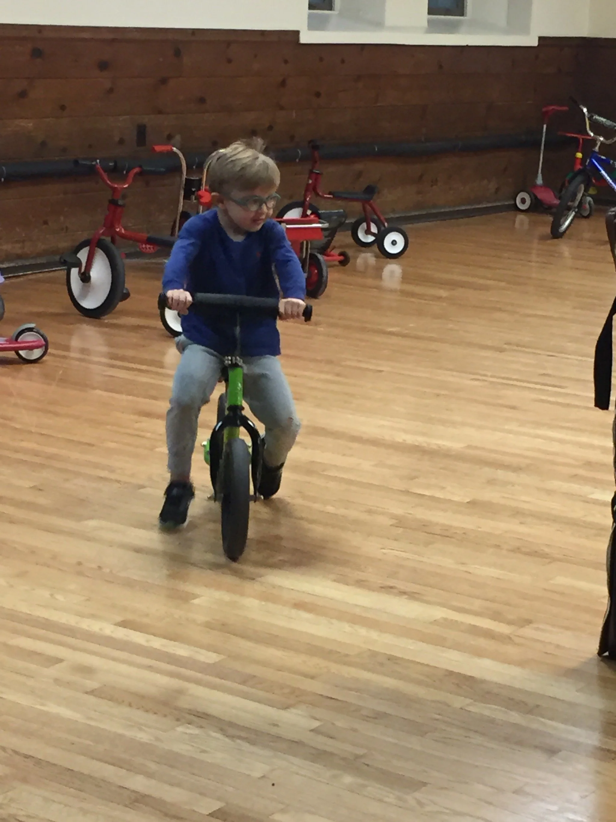 What appears to be just a cute snapshot of our Dunky brought me instantly to tears, because it has so much meaning. Part of our discussion was that Dunky has yet to fully participate in gym (45 minutes of the 3 hours he is there) and instead chooses to sit on the bench where it’s comfortable because he doesn’t have to talk. But one of our strategies is to have Caleb, Dunky and Daddy show up 10 minutes early and play together to get him engaged and playing and hope that it continues. They did that yesterday and today, and this here is the result. This little stinker was riding a Strider bike and NOT sitting on the bench by himself! There were still no words exchanged, but a small sign of comfort.